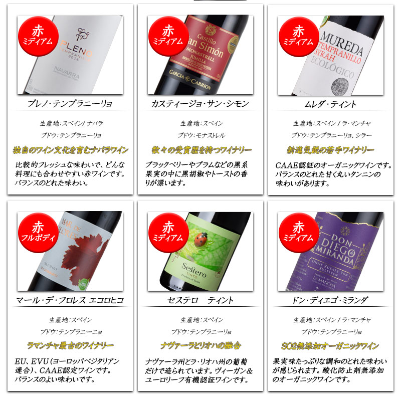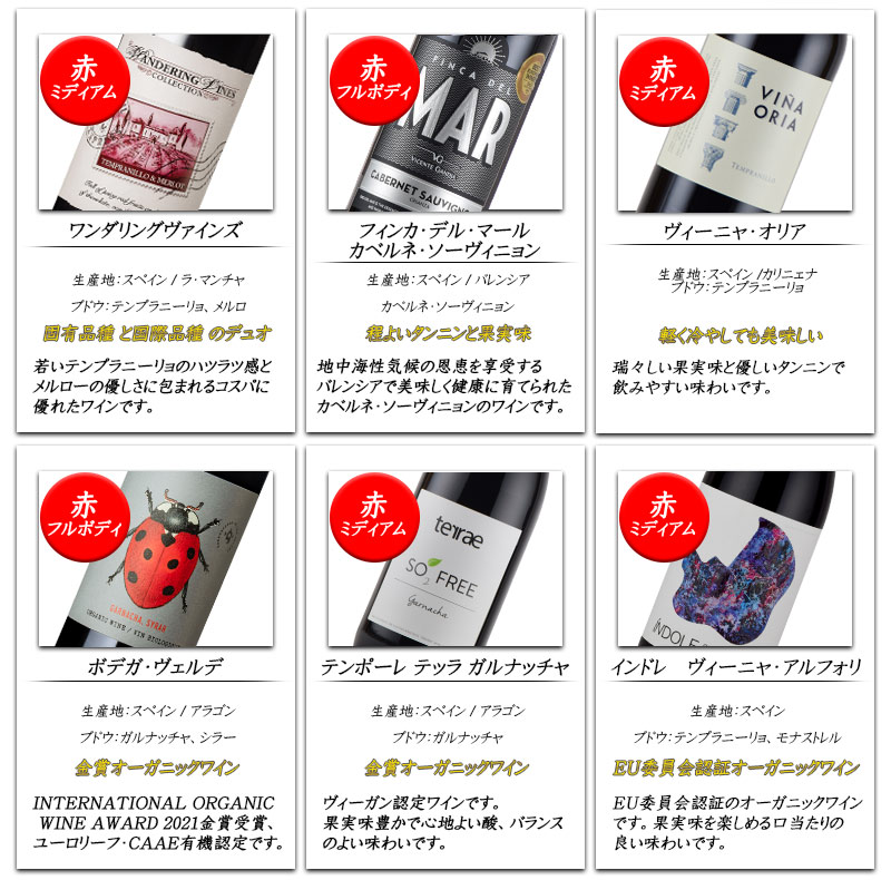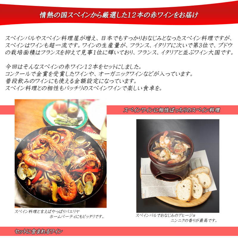 ワイン大国スペインの赤ワインだけを12本集めました。金賞ワインやオーガニックワインなど個性豊かなワインが揃っています。