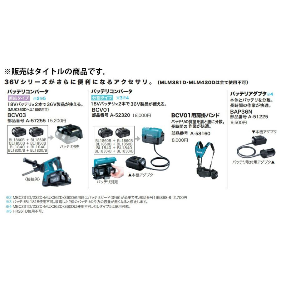 マキタ makitaバッテリコンバータBCV01 A-52320※バッテリは別販売品です。18Vバッテリx2本で36V製品が使える。適用バッテリBL1860B + BL1860BBL1850B + BL1850BBL1840 + BL1840BL1830/B + BL1830/B※ バッテリBL1815使用。装着した2個のバッテリの片方の容量が無くなると停止します。※MLM381D・MLM430Dは全て使用。※MBC231D/232D・MUX362D/360Dは使用。但しタイプは使用可能。マキタ makita