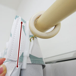 ※当店既製サイズのカーテンにはBタイプフックを標準で付属しています。お使いのカーテンレールによって使い分けてください。 このカーテンにはアジャスターフックを使用していますので、裾の位置をお手元で調整することができます。 ほぼ5mm間隔で、4cm程度裾を上下することができます。