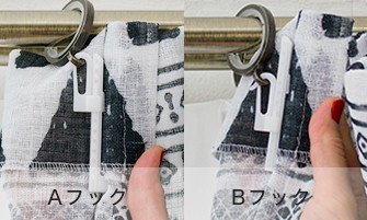 カーテンレールが見える状態をAフック、隠れる状態をBフックと呼びます。ほぼ5mm間隔で4cm程度裾を上げ下げすることができます。