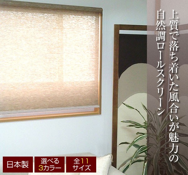 自然な風合いが和室にも洋室にも馴染みやすい自然調ロールスクリーン 上質で落ち着いた風合いが魅力のナチュラル系生地を使用したロールスクリーン。和室はもちろん、ナチュラル・モダンな空間など幅広いシーンにマッチします。ほどよく光を取り入れてくれるので、夏の暑い時期も快適に過ごせます。サイズ展開も豊富で高さが220cmまで対応しているので、大きめの窓にもご使用いただけます。カラーはアイボリー・ブラウン・ダークグレーの3色展開でお部屋のインテリアや雰囲気に合わせてお選びいただけます。