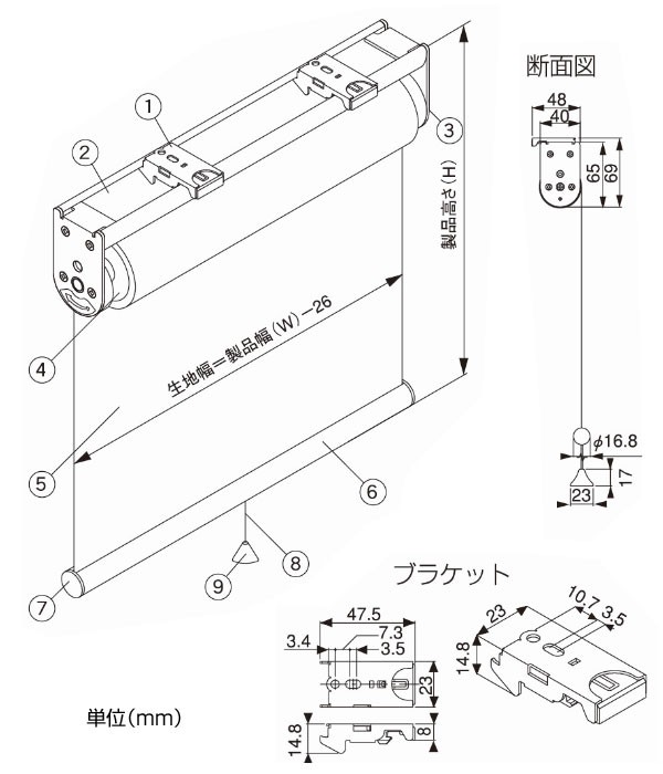 日本製 ロールスクリーン ナチュラル生地 ロールアップシェード 幅135×高さ180cm 巻上げ 機械式 静音 遮光