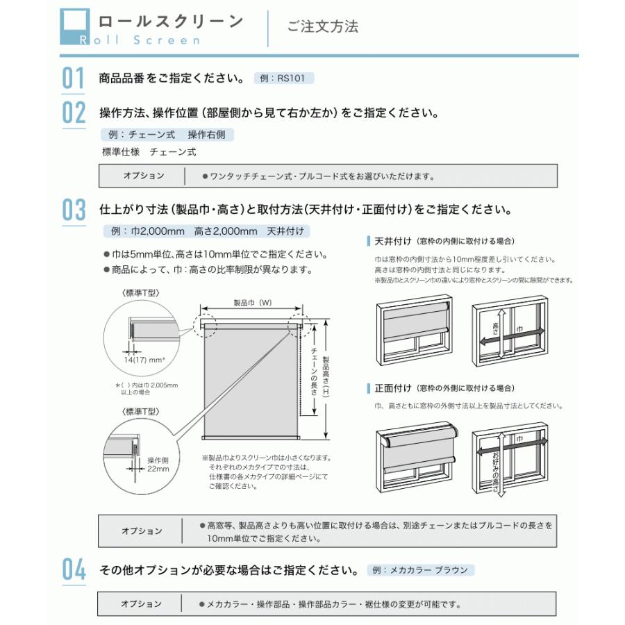 サンゲツ ロールスクリーン RBコレクション ■セレクトカラー40R RS101〜RS140 幅広いサイズに対応、お部屋を広くスッキリと見せます。特に小窓や腰窓におすすめ、間仕切りや目隠しにも。メカタイプ:標準T型操作方法:チェーン式メカカラー:ホワイト裾仕様:ラッピング(袋縫い)※操作方法・メカカラー・裾仕様は変更ができます。機能:防炎・ウォッシャブル・ホルムアルデヒド対策品組成:ポリエステル100%製作可能寸法比率(巾:高さ)1:8 ※ワンタッチチェーン式・プルコード式は1:3巾5mm単位、高さ10mm単位でオーダー製作いたします。高窓等、製品高さよりも高い位置に取付ける場合は、チェーンの長さを10mm単位でご指定ください。画像の色とは多少異なる場合があります。