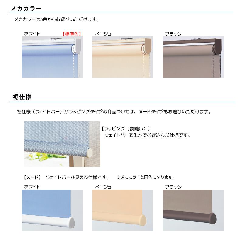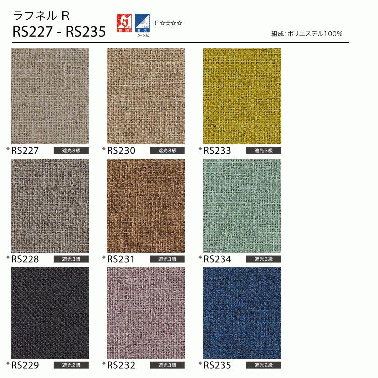 サンゲツ ロールスクリーン RBコレクション ■ラフネルR RS227〜RS235 遮光遮光2級〜遮光3級のロールスクリーンです。生地の製法上、表情はランダムになります。メカタイプ:標準T型操作方法:チェーン式メカカラー:ホワイト裾仕様:ラッピング(袋縫い)※操作方法はチェーン式になります。※メカカラー・裾仕様は変更ができます。機能:防炎・遮光2級〜3級・ホルムアルデヒド対策品組成:ポリエステル100%製作可能寸法比率(巾:高さ)1:8巾5mm単位、高さ10mm単位でオーダー製作いたします。高窓等、製品高さよりも高い位置に取付ける場合は、チェーンの長さを10mm単位でご指定ください。画像の色とは多少異なる場合があります。