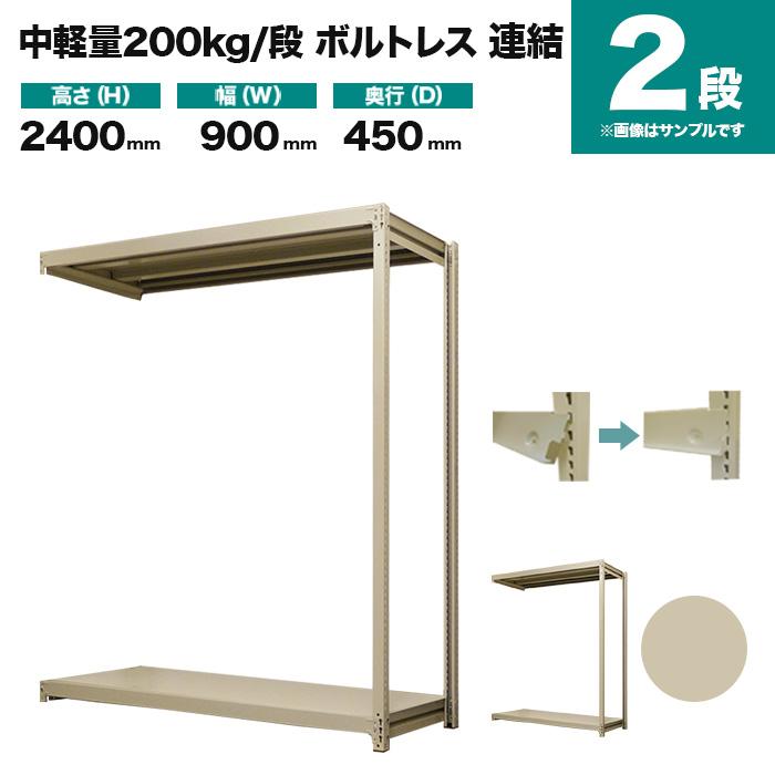【中軽量スチールラック 200kg/段ボルトレスの特長】・中棚受けは支柱にワンタッチで取り付けることができ、ハンマーで叩き込む必要はなく、棚板の移動も簡単にできます。・支柱の穴は当社オリジナルの25mmピッチで、他社品(50mmピッチ)に比べ収納力があり、コストパフォーマンスに優れています。商品名:業務用スチールラック 200kg/段 ボルトレスタイプ 連結形式表示寸法:高さ2400×間口900×奥行450mm実寸法:高さ2404×間口860×奥行450mm段数:2段重量:23kg最大耐荷重:200kg(棚板1枚当たり)最大均等積載荷重:MAX1000kg(1台当たり)主材料:スチール(鉄)カラー:アイボリー塗料:高級メラミン焼付け塗装生産国:日本(国産品)梱包と出荷形状:部材・部品のダンボール簡易包装(お客様組立品)専門店だからできる国産・高品質の業務用スチール棚を低価格で翌日出荷!●低価格で国産・高品質の業務用スチール棚●揺れに強い3本爪の唯一のスチールラック●在庫があれば翌日出荷!送料無料!●大型物件にも対応可能!まとめ買い割引きも!"}