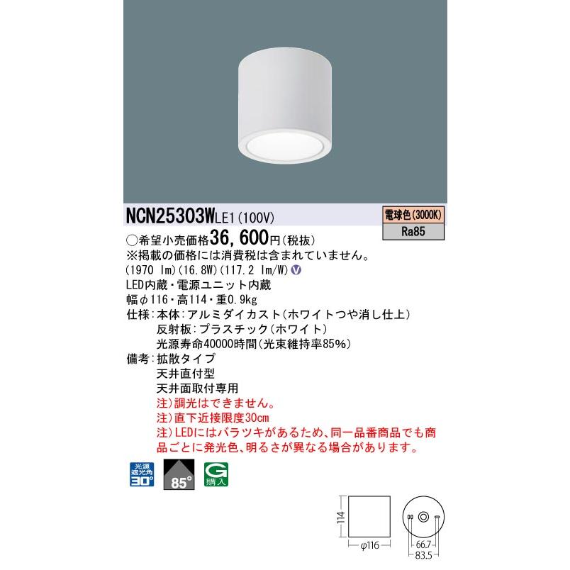 [法人限定] NCN25303W LE1 パナソニックスポットライト 天井直付 電球色 小型シーリングライト ビーム角85度 拡散 光源遮光角30度 [ NCN25303WLE1 ]