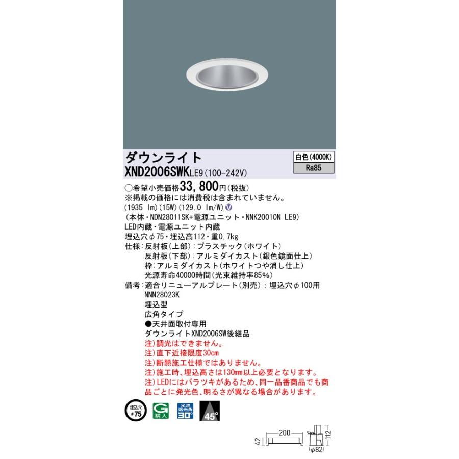 【法人様限定】【XND2006SWK LE9】パナソニック LEDダウンライト(白色) 天井埋込型 ビーム角45度・広角タイプ・光源遮光角30度 埋込穴φ75 コンパクト形蛍光灯FHT42形1灯器具相当 panasonic/き品※品番にて注文をさせていただきます。メーカーにて品番の確認をお願いいたします。画像はイメージです。●【本体】NDN28011SK●【電源ユニット】NNK20010N LE9●LED内蔵、電源ユニット内蔵●LED(白色)●色温度:4000K●光源寿命40000時間(光束維持率85%)●埋込穴径:φ75mm●埋込高:112mm●質量:0.7kg●器具光束:1935lm●電圧:100〜242V●消費電力:15W●消費効率:129lm/W●【反射板(上部)】プラスチック(ホワイト)●【反射板(下部)】アルミダイカスト(銀色鏡面仕上)●【枠】アルミダイカスト(ホワイトつや消し仕上)●天井埋込型、埋込穴φ75、ビーム角45度・広角タイプ・光源遮光角30度●Ra85●埋込型●広角タイプ●天井面取付専用●入力電流(100V時):0.156A●入力電流(200V時):0.078A●入力電流(242V時):0.067A●注)調光はできません。●注)直下近接限度30cm●注)断熱施工仕様ではありません。