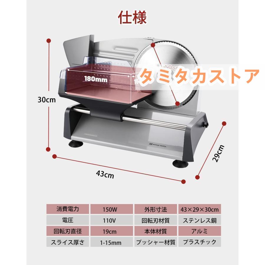 【製品仕様】電圧:110V消費電力:150W製品サイズ:41.8x29.3x32.5cm製品重量:5.5kg厚さ調整範囲:1~15mm【ご注意】ブレードをお手入れする場合は、刃先で指などを傷つけないよう取り扱いに十分にご注意ください。柔らかい肉などの食材は、冷やして半冷凍状態(3-4℃)にしてからスライスしてください。冷凍肉は3-4℃に解凍してからスライスしてください。本品は硬い骨など硬すぎる食材には適用しません。【1-15mm厚さ調節】薄切りのしゃぶしゃぶ用肉から厚切りのパンまで、幅広く厚さを調節して手軽にスライスできます。【各食材も処理でき】ハムやパン、チーズ、野菜、果物などの食材を手軽にスライスできる万能フードスライサーです。【安全作業】4つの吸盤で本体をしっかりと固定しますので、安定した状態で食材をスライスできます。【お手入れ簡単】ブレードは簡単に外して洗浄できます。【安全で衛生的】ブレードはステンレス鋼を採用し、錆びにくく長持ちです。福袋2023