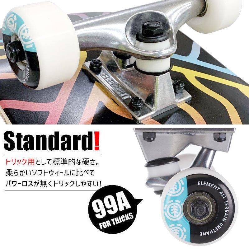■サイズ・7.75 x 31 インチ (約 19.685 x 78.74 cm)■仕様トラック:ELEMENT 5.0/5.25 TRUCKSウィール:ELEMENT 52mm/99Aベアリング:ABEC5(グリスタイプ)デッキテープ:ブラック■商品説明国内でも人気の高いスケボーブランド、ELEMEN(エレメント)のコンプリート(完成済み)スケートボードです。太陽光をイメージしたロゴグラフィックモデル。サイズは日本人好みの横幅7.75インチ。ストリート、パーク、ランプでのトリック用スペックです。直径52mm/硬度99A(トリック用標準)のウィールもデッキに合せたプリントの入ったコーディネート。その他パーツも同社製のレギュラーモデルを使ってバランスよく組み上げられており、これからスケートを始める 初心者 の方や、量販店のトイボードからの乗り換えにピッタリの一台。■実店舗とかねていますので、商品が完売の場合がございます。ご了承くださいませ。■入荷時期によりトラック、ベアリングの仕様に変更がある場合がございます。