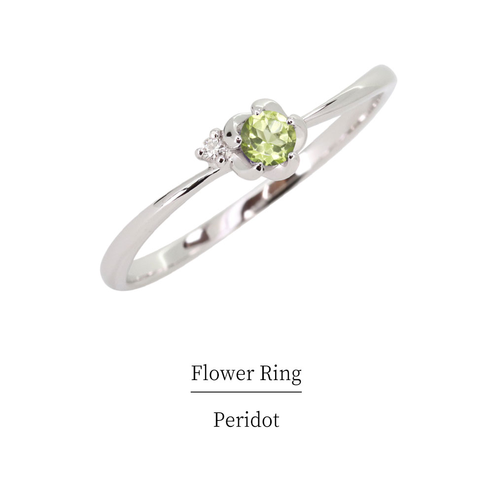 8月誕生石ペリドットを使用したシルバー製の、フラワー(花)モチーフリング(指輪)です。輝く天然石を包み込んだお花が、美しく色づいているような可憐なデザイン。※対応サイズ【1号から16号】※こちらの商品は【カラー3色の中から】お選び頂けます。本体素材:シルバー925(ホワイトコーティング/イエローコーティング/ピンクコーティング)(品質を保証するSV925 or SILVERの刻印があります。)石名:主石 ペリドット(約3.0mm 天然石使用)脇石 ダイヤモンド(約0.01ct 天然石使用)サイズ:最大幅 約4.5mm 最小幅 約0.8mm最大厚み 約3.3mm 最小厚み 約1.0mm品番:mr-0124-8-sv【20231002】"}
