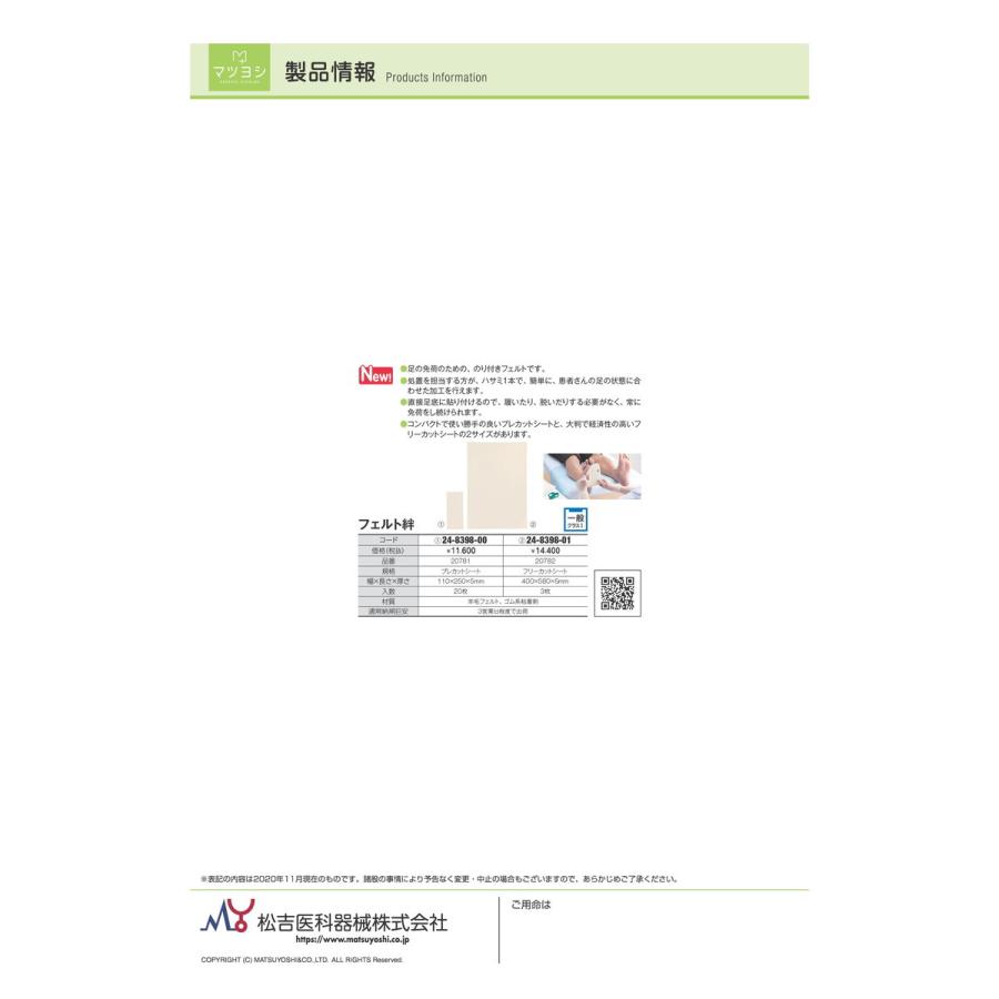 【病院専用商品】 ●品名 フェルト絆フリーカットシート(大判) 20782(3マイイリ) ●コード番号 00156552 ●入数 1入り ●備考 医療機器対象外 ●メーカー希望小売価格 ¥15000●JAN4900070207827●商品詳細 ●商品説明 ●足の免荷のための、のり付きフェルトです。●処置を担当する方が、ハサミ1本で、簡単に、患者さんの足の状態に合わせた加工を行えます。●直接足底に貼り付けるので、履いたり、脱いだりする必要がなく、常に免荷をし続けられます。●コンパクトで使い勝手の良いプレカットシートと、大判で経済性の高いフリーカットシートの2サイズがあります。 ●商品スペック ●規格:フリーカットシート ●幅×長さ×厚さ:400×580×5mm ●入数:3枚 ●材質:羊毛フェルト、ゴム系粘着剤 ●メーカー名 アルケア●メーカー品番 20782 ●JANコード 4900070207827●品名 フェルト絆フリーカットシート(大判)●商品説明 ●足の免荷のための、のり付きフェルトです。●処置を担当する方が、ハサミ1本で、簡単に、患者さんの足の状態に合わせた加工を行えます。●直接足底に貼り付けるので、履いたり、脱いだりする必要がなく、常に免荷をし続けられます。●コンパクトで使い勝手の良いプレカットシートと、大判で経済性の高いフリーカットシートの2サイズがあります。 ●商品スペック ●規格:フリーカットシート ●幅×長さ×厚さ:400×580×5mm ●入数:3枚 ●材質:羊毛フェルト、ゴム系粘着剤 ●メーカー名 アルケア●メーカー品番 20782 ●JANコード 4900070207827 ●メーカー希望小売価格 ¥15000●JAN4900070207827●商品詳細 医療機器対象外