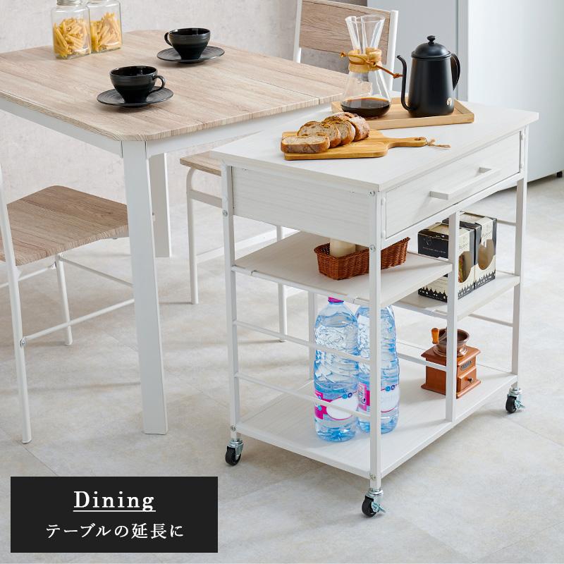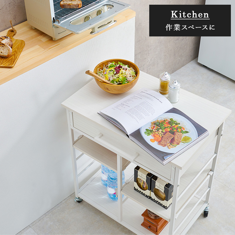 作業スペースや補助テーブルとしても快適な広々天板のキッチンワゴン。カトラリーなどを収納できる引出付き。■サイズ: (約)幅60×奥行40(取っ手含む42.5)×高さ70cm■素材: フレーム:スチール天板:合成樹脂化粧繊維板(メラミン樹脂)■生産地: 中国製■その他:・組立式・キャスター付・可動棚×2枚