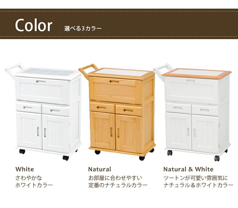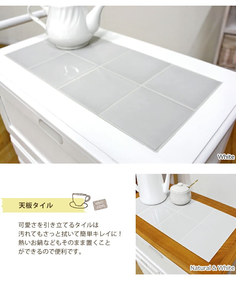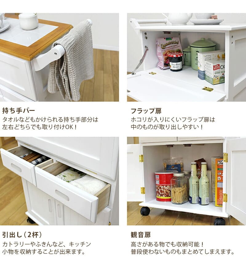 おしゃれな カントリーキッチンワゴン 扉付き キャスター付き キッチンワゴン キッチン作業台 キッチン用ワゴン天然木キッチンワゴン 天板タイル キッチンキャビネット 収納力 キャスター付き 可愛い キッチン収納ワゴン フラップ扉 母の日キャスター付きで移動も楽々なシンプルなキッチンワゴン。天板はタイル張りなので熱い鍋、やかんなどを直接置くことが可能です。"}