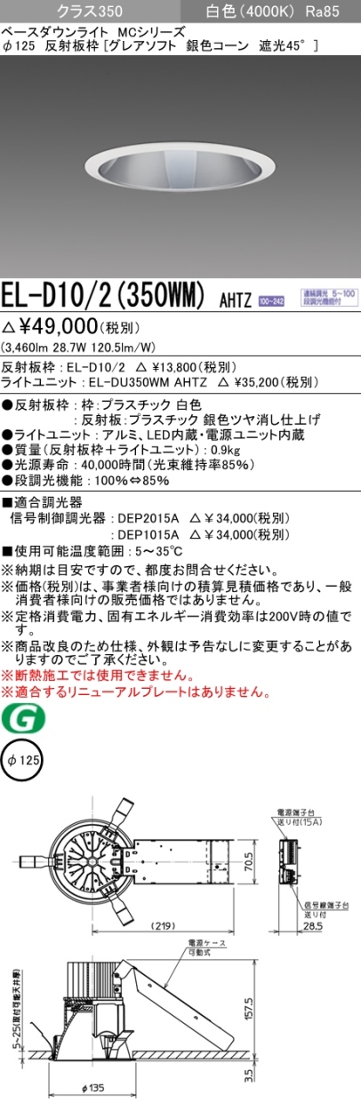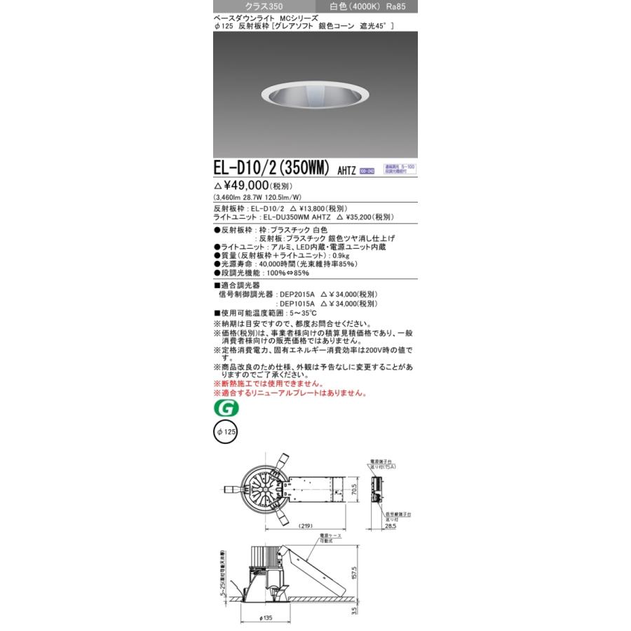三菱 EL-D10/2(350WM) AHTZ LEDダウンライト クラス350 連続・段調光 白色 Ra85 グレアソフト 銀色コーン遮光45° φ125 HID70形相当 器具+ライトユニット