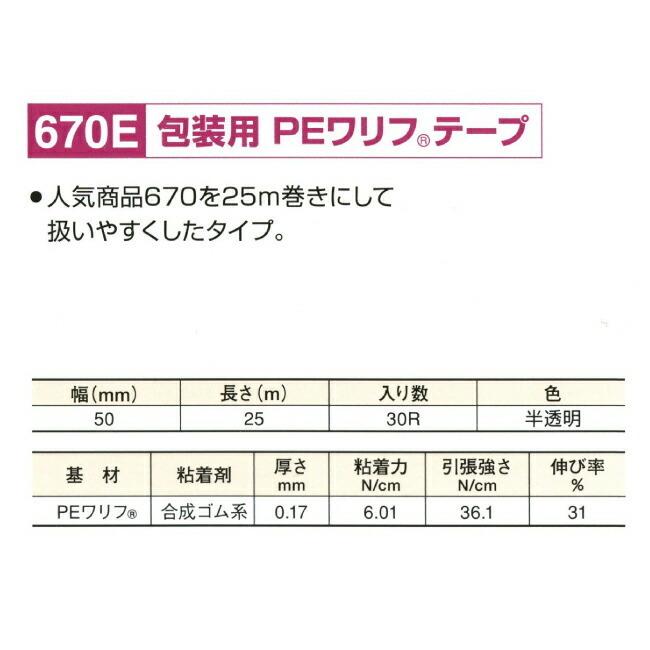 薄くて丈夫。手でまっすぐ切れて、水にも強い。PEワリフテープ #670を25m巻にして、扱いやすくしました。薄手で耐久性に優れ、手で切れて作業性が高い。文字も書ける半透明タイプ。【商品詳細】●サイズ:50mm×25m巻●カラー:半透明●1箱(30巻入り)【用途】●一般梱包用【送料】■全国送料無料※沖縄・離島への配送は対応しておりません。※個人宅への配送は対応しておりません。※御注文時に法人名や店名等のご入力をお願い致します。"} 薄くて丈夫。手でまっすぐ切れて、水にも強い。