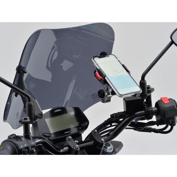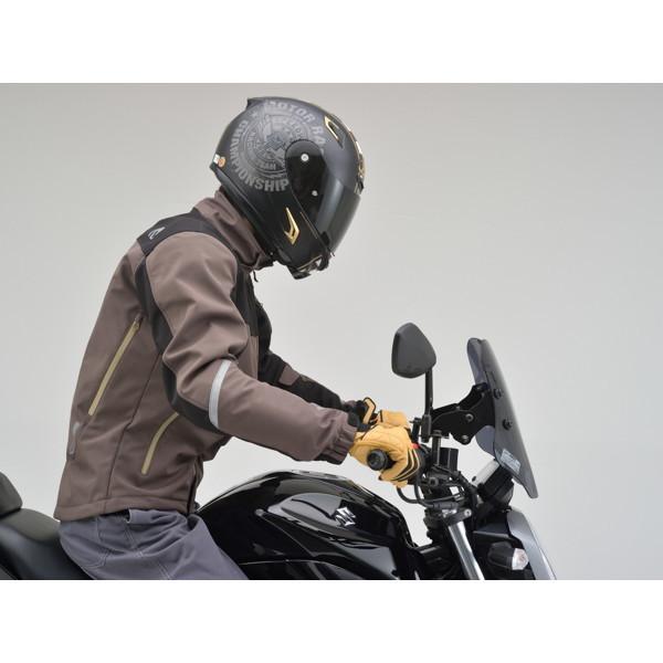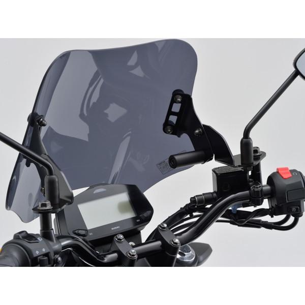 ★ スタイリッシュなエアロフォルムのウインドシールド。ポリカーボネート(厚さ3mm)を採用。同厚のアクリルに対し約30倍の強度を持ち、高い透明度と耐久性を両立。またハードコート処理を施すことで耐傷性もアップしています。ウインドシールドの角度調整(約10度)が可能な車種専用の取付ステー付き。スマホやメーター等が装着可能なφ22.2のオプションバー付属。