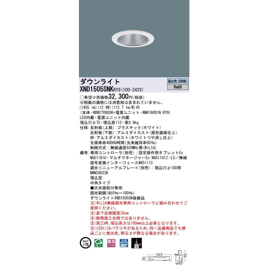 【法人様限定】パナソニック XND1505SNK RY9 LEDダウンライト ビーム角25度 中角 調光 埋込穴φ75 昼白色【NDN27090SK + NNK16001N RY9】