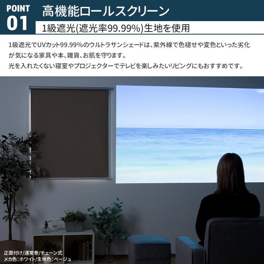 防水・1級遮光(遮光率99.99%)のロールスクリーン!日差しが強くサンシェードやすだれを取り付けたいけれど、外壁に取り付け金具を取り付けられず、お困りのお客様に。裏面のアルミコーティングが紫外線を99.99%カットし、さらに防音効果を発揮します。■商品名:ロールスクリーン ウルトラサンシェード■サイズ:幅0.5cm単位、丈1cm単位サイズオーダー可能■カラー:ベージュ、グリーン、ブラウン、ネイビー、グレー■材質:生地/ポリエステル100%、メカ/樹脂・鉄、ボトムバー/樹脂(ホワイト)・アルミ(ブラック)■機能:1級遮光、断熱、遮熱、UVカット■チェーン操作:プルコード操作orチェーン操作(左・右)■取付方法:天井付けor正面付け■巻:通常巻or逆巻■部品カラー:ホワイトorブラック■生産国:日本ロールスクリーン 遮光1級 オーダー ロールカーテン 遮熱 断熱 UVカット 日本製目隠し 紫外線カット 無地 天井付け 正面付け 北欧 和風 プルコード チェーン プルハンドル カーテンレール ホームシアター 寝室