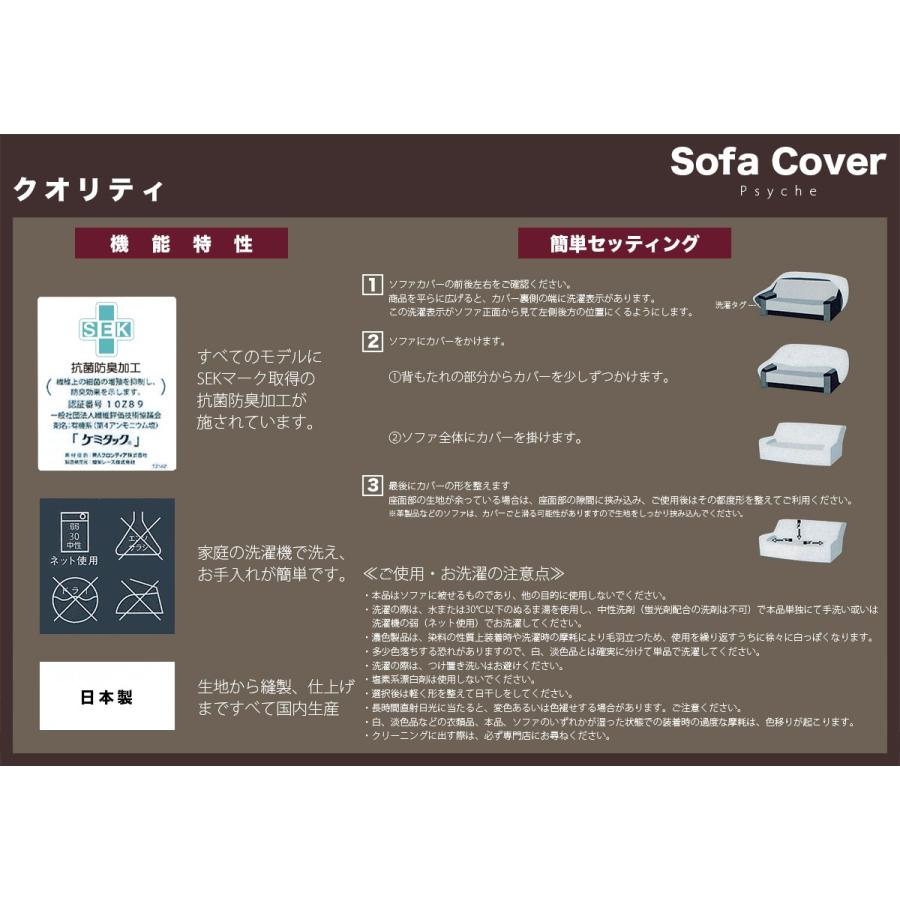 | psyche(プシュケ)とは、ギリシャ神話の中で人間から神になる女神のことです。のちにギリシャ語で、サナギから美しく変容する「蝶」や、変化していく「心」を意味するようになりました。 純国内生産にこだわり、本物のクオリティを追求したソファカバーです。 ポリエステル素材がほとんどの従来人のソファカバーに対して、コットン比率を大幅にアップすることで抜群の肌触りと吸湿性を実現しました。またいつでも快適にご愛用していただけるように抗菌防臭加工も施してあります。 高いストレッチ性で多くのソファにぴったりとフィットします。 お手持ちのソファの汚れ防止はもちろん、時期に合わせたドレスアップとしても、是非ご活用ください。 新開発素材を採用しています。 収縮率180%の贅沢なストレッチ素材を使用。綿を76%配合した極上の肌触りと抜群の吸湿性で熱のこもりやすいウレタンや化繊、合成皮革等のソファに最適です。 国産品質をお届けします。 群馬県桐生産の最高品質ジャガードを使用し、パターンメイク、裁断、縫製までを自社工場で徹底してかんりしていますので「サイズが合わない」「縫製が悪い」といった品質のムラがありません。評判の良いジャパンクオリティ。 最高の機能を装備しました。 抗菌・消臭機能は最高水準のSEK認証マークを取得。小さなお子さまやペットのおられるご家庭でもより安心してお使い頂けます。汚れたらご家庭の洗濯機で簡単に洗濯することが可能です。 |