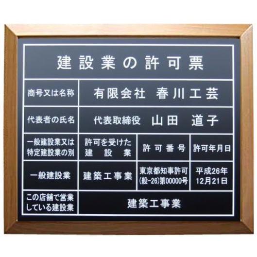 建設業の許可票【右画像の新レイアウト】木地額入り・板面はブラック /事務所用額入り アクリル 安値 標識 掲示板 法定看板 表示プレート