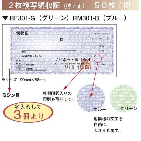 領収証 2枚複写 2色刷 領収書 名入れ 2枚複写収証RF301-G/B サイズ190×88mm rf301-G 印影なし6冊