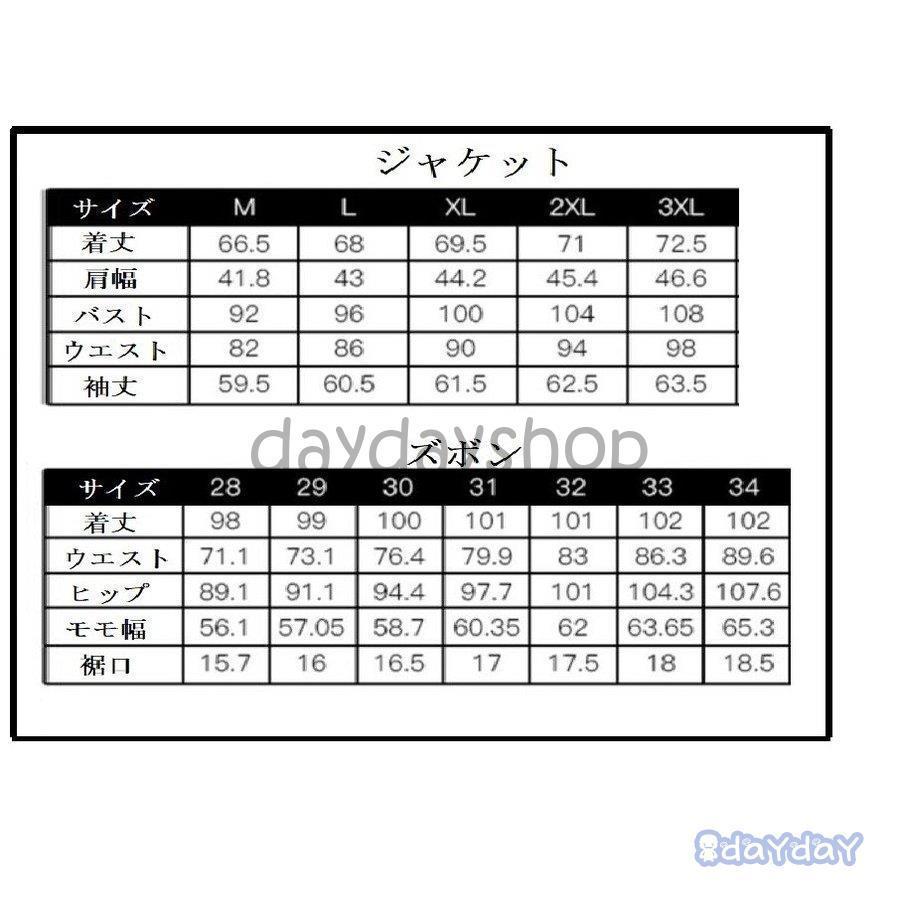 2点セット:ジャケット+ズボンカラー:写真通り素材:ポリエステル、レーヨン裏地:ポリエステルサイズ:写真通り【 M】【L】【 XL】【2XL】【3XL】●適応シーズン :夏 春 秋 冬★サイズ違いによる返品、交換は対応致しかねますので、必ず実寸サイズをご下さい。★機械による生産過程におきまして、どうしても生地を織る際の糸の継ぎ目や多少のほつれ、または色ムラなどが生じている場合がございます。★サイズは人の手によって測っているため、1-3cmの誤差がある場合がございます。予めご了承下さいませ。