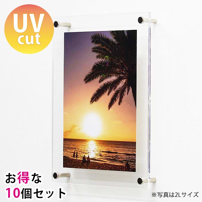【まとめ買い】10個まとめたお得なセット。1個につき定価の10%OFFの価格です。壁から浮かせて飾るシンプルな構造のアクリル写真立て。スタンダードなデザインはどんなインテリアにも最適です。●アクリル板にはさみ込み写真・ハガキ・パンフレット・メニューなど様々な物が飾れるフォトフレームです。●壁から20ミリ浮かせて飾れるので立体感が違います。●壁掛け部分が見えずにスッキリ飾れます。●表板は絵や写真の変色を防ぐ「紫外線カットタイプ(UVカットクリアー)」(裏板は通常のクリアー)。【仕様】■飾る物の標準サイズ:148×100mm(ハガキ)■飾る物の最大サイズ:163×113mm■飾る物の厚さ:最大0.5mm■製品全体のサイズ:190×140mm■表板:UVカットクリアー2mm■裏板:クリアー3mm■重量:約200g■飾る方向:縦横共用■タイプ:壁掛けスタンド共用【注意】※個別の箱に入っておりません。※標準サイズより飾る物が小さい場合、ずれる可能性がある為、弱粘着タイプの両面テープ等の併用をお勧め致します。"}
