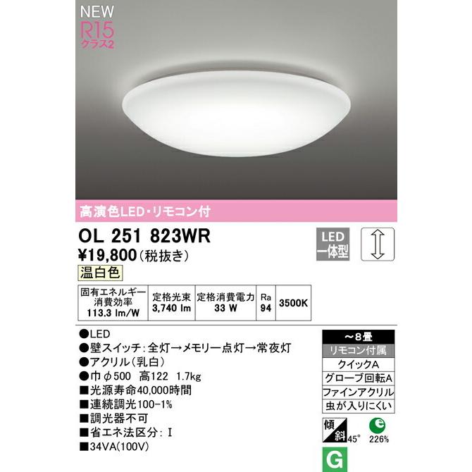 【決済・後払い決済】 高演色LED・リモコン付 OL251823WR 温白色 3500K 消費電力33W Ra94 ●LED ●壁スイッチ:全灯→メモリー点灯→常夜灯 ●クリル(乳白) ●巾φ500 高122 1.7kg ■光源寿命40,000時間 ■連続調光100-1% ■調光器 〜8畳 リモコン付属 クイックA グローブ回転A ファインアクリル 虫が入りにくい 226% 45° 省エネ達成率 傾斜天井対応 その他メーカーへのお問い合わせはコチラ →