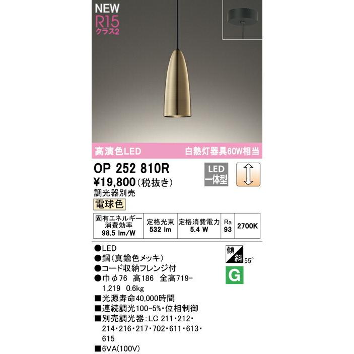 【決済・後払い決済】 高演色LED 白熱灯器具60W相当 OP252810R 電球色 2700K 調光器別売 消費電力5.4W Ra93 ●LED ●(真鍮色メッキ) ●コード収納フレンジ付 ●巾φ76 高186 全高719-1,219 0.6kg ■光源寿命40,000時間 ■連続調光100-5%・位相制御 55° 傾斜天井対応 その他メーカーへのお問い合わせはコチラ →