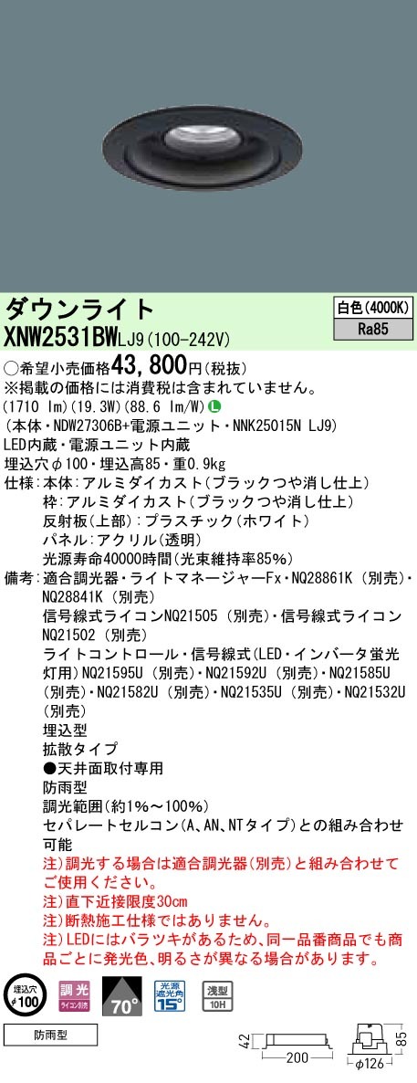 XNW2531BW LJ9 軒下用ダウンライトLED内蔵、電源ユニット内蔵【本体】NDW27306B【電源ユニット】NNK25015N LJ9光源◆LED(白色) ◆色温度:4000 K ◆光源寿命40000時間(光束維持率85%)寸法・質量◆埋込穴径:φ100 mm ◆埋込高:85 mm◆質量:0.9 kg仕様◆器具光束:1710 lm ◆電圧:100〜242 V ◆消費電力:19.3 W ◆消費効率:88.6 lm/W◆【本体】アルミダイカスト(ブラックつや消し仕上)◆【枠】アルミダイカスト(ブラックつや消し仕上)◆【反射板(上部)】プラスチック(ホワイト)◆【パネル】アクリル(透明)◆Ra85◆埋込型◆拡散タイプ 光源遮光角15度◆●天井面取付専用◆防雨型◆調光範囲(約1%〜100%)◆セパレートセルコン(A、AN、NTタイプ)との組み合わせ可能◆調光する場合は適合調光器(別売)と組み合わせてご使用ください。◆直下近接限度30cm◆断熱施工仕様ではありません。
