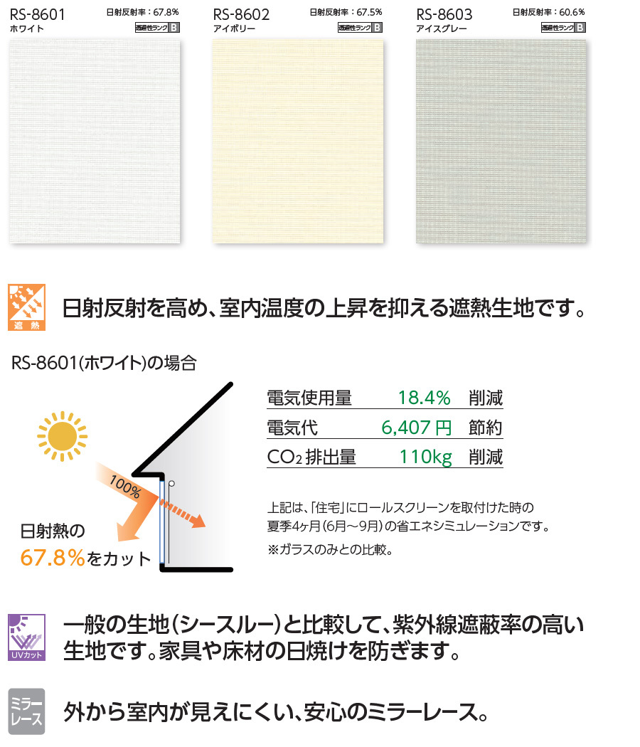 タチカワ ロールカーテン 紫外線遮蔽率の高い生地のロールスクリーン。1枚のスクリーンを巻き上げることにより、採光を自由に調整します。・タチカワブラインド・マタン遮熱・生地組成:ポリエステル100% ・機能:防炎、遮熱、UVカット、ミラーレース(RS8601 RS8602 RS8603)"} タチカワブラインド ロールスクリーン ラルク