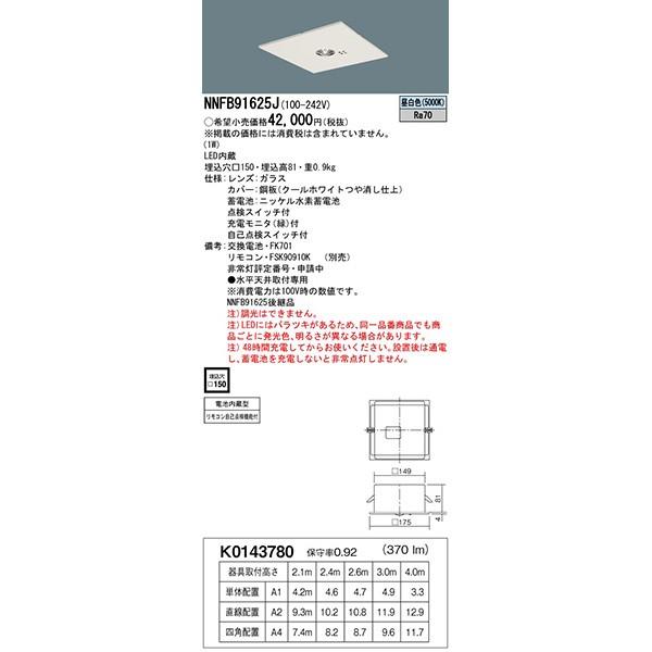 ※後継品にて出荷致します。※NNFB91625の後継品リニューアル用 天井埋込型 LED(昼白色) 非常用照明器具 一般型(30分間) リモコン自己点検機能付/埋込穴□150 非常時専用LED内蔵◆非常時・非常灯用LED点灯 常時消灯◆光源色温度:5000 K◆埋込穴角:□150 mm ◆埋込高:81 mm◆質量:0.9 kg◆電圧:100〜242 V ◆消費電力:1 W◆【レンズ】ガラス◆【カバー】鋼板(クールホワイトつや消し仕上)◆【蓄電池】ニッケル水素蓄電池◆点検スイッチ付◆充電モニタ(緑)付◆自己点検スイッチ付◆Ra70【交換電池】FK701【リモコン】FSK90910K (別売)◆●水平天井取付専用◆※消費電力は100V時の数値です。◆配光番号:K0143780