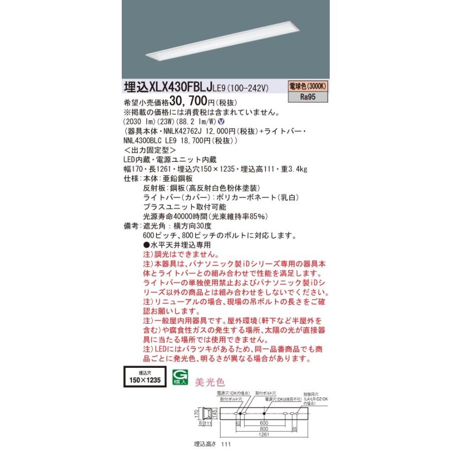 XLX430FBLJLE9 パナソニック 埋込ベースライト LED(電球色)