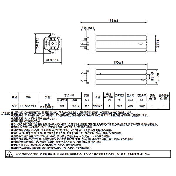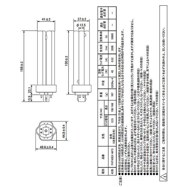 Panasonic パナソニック●品名:ツイン蛍光灯・スリムなガラス管をブリッジ技術で結合させた蛍光灯。ツイン蛍光灯■ツイン3(6本束状ブリッジ)●種別:42形●品番:FHT42EX-WF3●光色:温白色(3波長温白色)●色温度:4200K●寸法(mm):ガラス管径 12.5 長さ 150/166●質量(g):107●口金:GX24q-4●定格ランプ電力(W):42●ランプ電流(A):0.32●全光束(lm):3200●色温度(K):3000●定格寿命(h):10000●標準梱包:10×1・御注文品番:FHT42EX-WF3・POSコード(下6桁):596319(JAN:4549980596319)※品番:FHT42EX-W・・・全商品と互換性がございます。詳しくは是非お気軽にお問い合わせ下さい!※沖縄・離島一部指定地域への配送は別途お見積りとなります。こちらも、是非お気軽にお問合せ下さい!関連商品:東芝 FHT42EXW ユーライン3 FHT42EXWK FHT42EXWK2 FHT42EXWTS 三菱 FHT42EXW BB3 FHT42EXWK FHT42EXWBB3日立 FHT42EXWB Hfパラライト3 FHT42EXWC FHT42EXWJ FHT42EXWV FHT42EXWVJNEC FHT42EX-Wキキ Hfカプル3 FHT42EXWキキ●5個セット 送料無料!