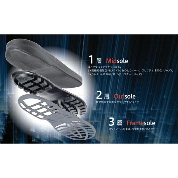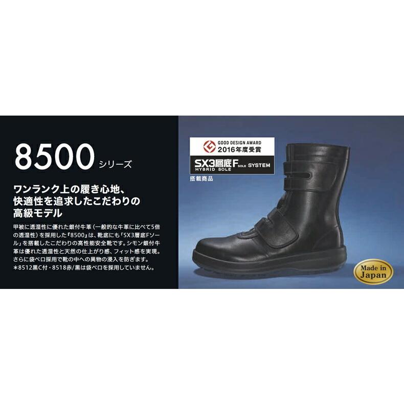 ワンランク上の履き心地、快適性を追求したこだわりの高級モデル規格:JIS T 8101 革製S種〈普通作業用〉EF合格サイズ:23.5〜28.0,29.0,30.0(EEE) ※29cm、30cmは割高になります。甲被:銀付牛革重量:1,070g /足(26cm)先芯:ワイドACM樹脂先芯靴底:SX3層底Fソール(SX高機能樹脂+2層SXラバー) ミッドソールには加水分解しないSX高機能樹脂袋ベロ採用で靴の中への異物の混入を防ぐ※2018年3月に仕様変更があり、靴底がSX3層底Fソールになりました。※柔らかな材質の為、商品画像とは異なり、くるぶし部分等全体的にシワがあります。※原則的に、シモン安全靴は、返品・サイズ交換をお受けしておりません。