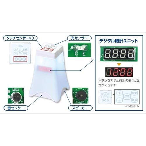 3つのセンサーで光と音をプログラミング!サイズ:完成サイズ:160×108×108mmセット内容:本体×1、USBケーブル×1、LED基板×1、タッチセンサー基板×1、フルカラーLED×4、デジタル時計ユニット×1、抵抗×3、スペーサー×2、ねじ×10重量:292g材質:ABS生産国:中国3つのセンサーで光と音をプログラミング