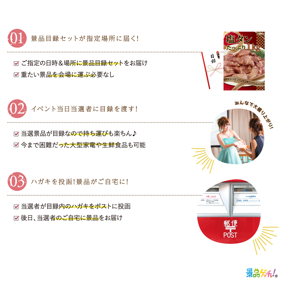 【お届け内容】・目録ハガキ(引換券)・景品発表 A4パネル・商品一覧表・個人情報保護シール※当商品は目録をお届けし、後日ご指定場所へ商品を発送いたします。"}
