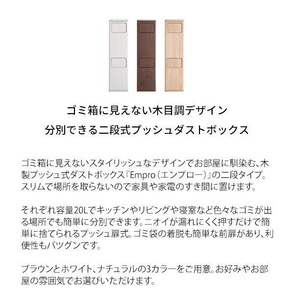 ゴミ箱に見えないスタイリッシュなデザインでお部屋に馴染む、木製プッシュ式ダストボックスの二段タイプ。スリムで場所を取らないので家具や家電のすき間に置けます。それぞれ容量20Lでキッチンやリビングや寝室など色々なゴミが出る場所でも簡単に分別できます。ニオイが漏れにくく押すだけで簡単に捨てられるプッシュ扉式。ゴミ袋の着脱も簡単な前扉があり、利便性もバツグンです。カラー:商品名に記載(ブラウン・ホワイト・ナチュラル)サイズ:幅25×奥行き30×高さ96cm材質 合成樹脂化粧パーティクルボード(塩化ビニル)組立式(約40分)、対応ポリ袋:各20L、天板耐荷重:約5kg【送料無料】※北海道/沖縄/離島のお届けに別途送料が必要となります。ごみ箱 ダストボックス 2段 プッシュ扉式 フタ付き ゴミ箱 20L 分別ゴミ箱 幅25 スリム 省スペース 臭いが漏れにくい 押すだけで簡単 袋留リング付 取替ラクラク キッチン 台所 デスク 寝室 リビング 見せるゴミ箱 分別ダスト 分別 キッチンペール"}