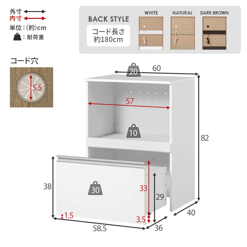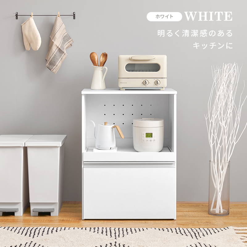 ■商品説明●立って作業がしやすい天板高さのカウンターキャビネット。●凹凸の少ないフラットなデザインでお部屋やキッチンにも馴染みやすく、モダンな空間を演出します。●豊富なシリーズ展開でシリーズで揃えると統一感のある空間になります。●無地ホワイト・木目調ナチュラル・木目調ダークブラウンの3種類からお選び頂けます。●天板スペースにはレンジやオーブンなどの大型キッチン家電置きや作業スペースにおすすめ。●スライド棚には炊飯器や電気ケトルなどを置ける棚になっており、スライドレールと2口コンセントがついています。●キャスター付き収納庫は2Lのペットボトルも収納できる大容量サイズでストッカーに。■商品詳細カラー:ダークブラウン ナチュラル ホワイト生産地:ベトナム製サイズ(約):幅60×奥行40×高さ82cm素材:主材:プリント紙化粧パーティクルボード、天板・スライド棚:合成樹脂化粧パーティクルボード、取手:スチール組立:お客様組み立て式