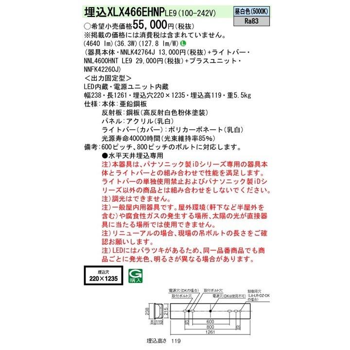●セット組合:【器具本体】NNLK42764J+【ライトバー】NNL4600HNT LE9+【プラスユニット】NNFK42260J●LED内蔵、電源ユニット内蔵●LED(昼白色)●色温度:5000K●光源寿命40000時間(光束維持率85%)●幅:238mm●長:1261mm●埋込穴幅:220mm●埋込穴長:1235mm●埋込高:119mm●質量:5.5kg●器具光束:4640lm●安定器出力型:定格出力型●安定器補足:<出力固定型>●電圧:100-242V●消費電力:36.3W●消費効率:127.8lm/W●【本体】亜鉛鋼板●【反射板】鋼板(高反射白色粉体塗装)●【パネル】アクリル(乳白)●【ライトバー(カバー)】ポリカーボネート(乳白)●Ra83●水平天井埋込専用●商品型番・パナソニック(PANASONIC)・XLX466EHNPLE9商品画像はイメージです。品番でのご注文となりますので、仕様やお色味などは事前にメーカーへご確認下さい。●メーカー問合せ先 【0120-878-709】●600ピッチ、800ピッチのボルトに対応します。●天井埋込型、乳白パネル、省エネタイプ・6900lmタイプ・昼白色・非調光●(注)本器具は、パナソニック製iDシリーズ専用の器具本体とライトバーとの組み合わせで性能を満足します。ライトバーの単独使用禁止およびパナソニック製iDシリーズ以外の商品とは組み合わせをしないでください。●(注)調光はできません。●(注)一般屋内用器具です。屋外環境(軒下など半屋外を含む)や腐食性ガスの発生する場所、太陽の光が直接器具に当たる場所では使用できません。●(注)リニューアルの場合、現場の吊ボルトの長さをご確認お願いします。●(注)LEDにはバラツキがあるため、同一品番商品でも商品ごとに発光色、明るさが異なる場合があります。