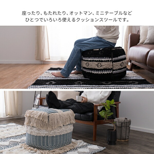 オットマンやミニテーブルとしても使える便利なクッションスツールです。