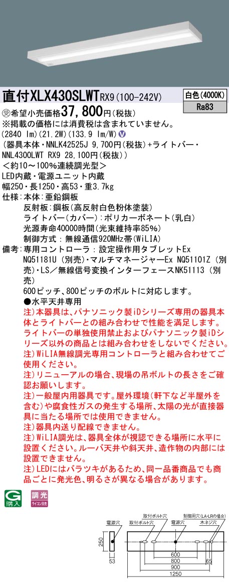 セット品番 XLX430SLWTRX9セット内訳型番 NNLK42525JJANコード 4549077776419型番 NNL4300LWTRX9JANコード 4549980424926パナソニック iDシリーズ3200 lmタイプ白色スリムベースWiLIA無線調光