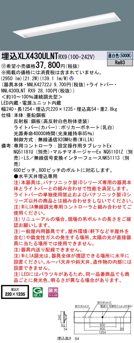 受注品 XLX430ULNTRX9 パナソニック iDシリーズ WiLIA無線調光 セット品内訳( NNLK42722J NNL4300LNTRX9 ) 法人様限定販売