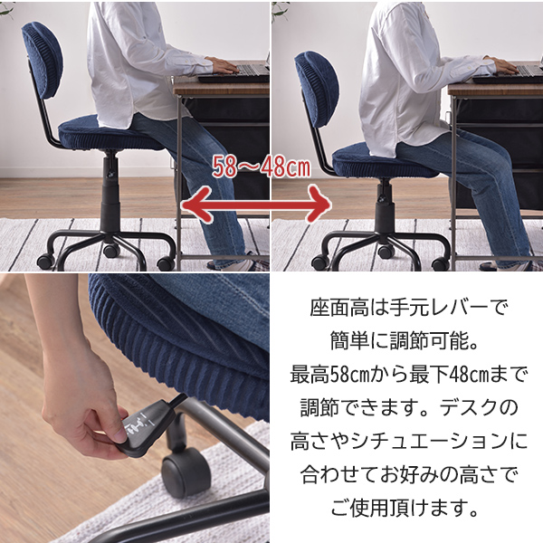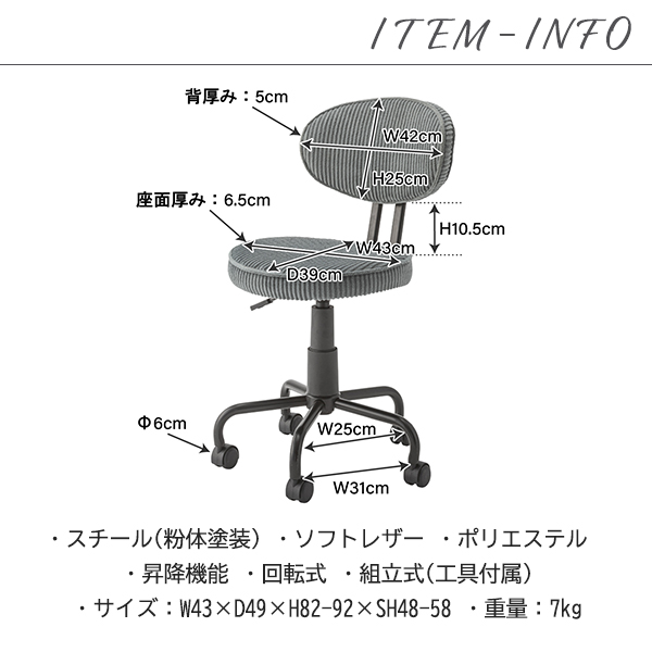 ◆商品詳細◆スチール(粉体塗装) ソフトレザー ポリエステル 昇降機能 回転式 ■組立式サイズ:W43×D49×H82-92×SH48-58cm商品重量:7.0kg◆備考◆メーカーから直送のため、他商品との同梱は出来かねます。こちらの商品はお客様組み立てとなります。キーワード送料無料 一年保証 コーデュロイ ソフトレザー シンプル デスクワーク 読書 サイドチェア キッチン 回転式 カフェ 移動らくらく 高級感"}
