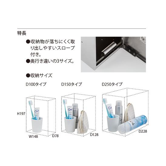 プライベートボックス 屋内タイプ D100タイプ シリーズ【 特長 】錠前:操作しやすいダイヤル式錠前です。つまみが大きいので、 扉の開閉もスムーズ。スロープ:収納物が落ちにくく取り出し やすいスロープ付き。【 カラー 】ブラック【 仕上 】本体:No.2B 仕上扉:ヘアーライン仕上 アクリル焼付塗装 色:クリア アクリル焼付塗装 カラーバリエーション設定【 材質 】本体:ステンレス (SUS304) t=0.7mm扉:ステンレス (SUS304) t=0.8mm【 サイズ 】H×W×D ボックス内寸法 200×150×100(197×148×78) 【 重量 】1.0kg【 品番 】KS-PV001S-D1-BK【 備考 】用途例 ●オフィスや商業施設のトイレで小物の保管箱として。 ●公共施設での一時的な保管箱として。貴重品は入れないでください。※画像はイメージです。※パッケージ、仕様、品番などの変更が予告なく変更される場合が御座います。カテゴリー 用品 現場 建築 おしゃれ シンプル"}