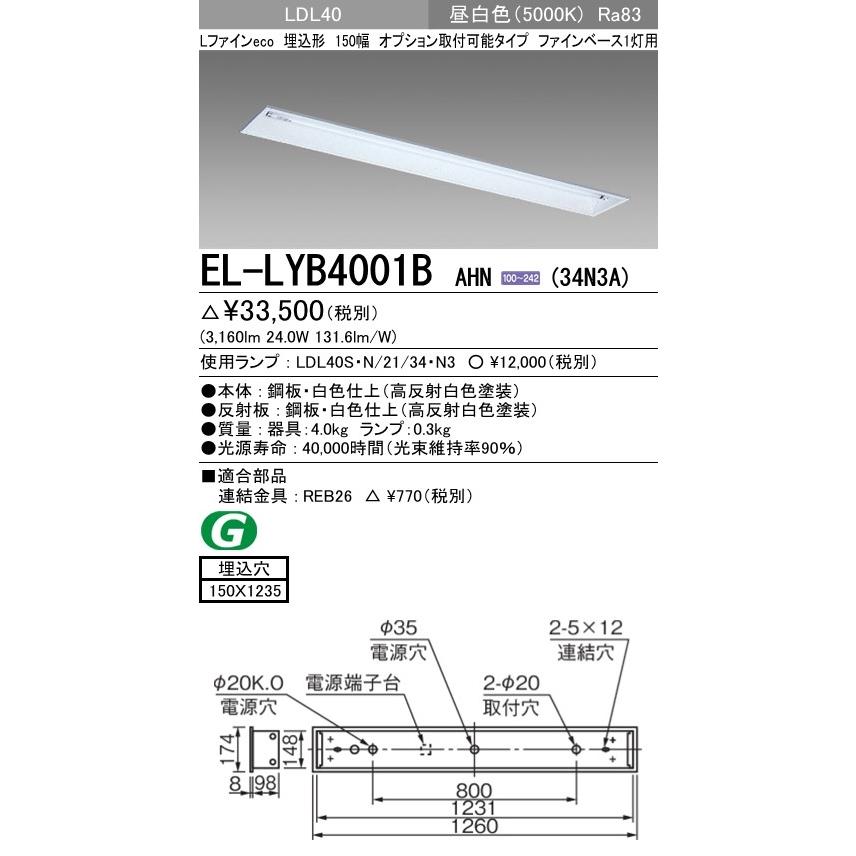 EL-LYB4001B AHN(34N3A)直管LEDランプ搭載 ベースライト 埋込形 LDL40 150幅 オプション取付可 ファインベース1灯用 3400lmクラスランプ付 昼白色 三菱電機