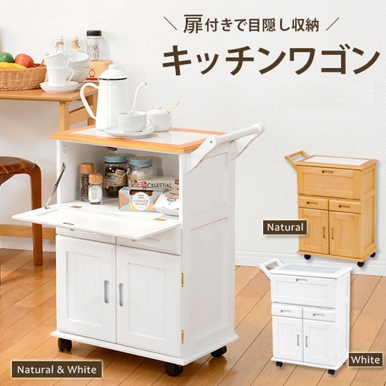 扉付きで目隠し収納!天然木とタイルの組み合わせが可愛いキッチンワゴンです!ナチュラル感のあるカントリー調ワゴンで、キッチンをオシャレに演出します!ストッパー付きのキャスターが付いていて移動も固定も便利!取っ手は、左右お好みで取付可能です。扉と引き出しの中は収納力バツグンで、スッキリとキッチンの整理整頓ができますね。カラーは、ホワイト、ナチュラル、ナチュラルホワイトの3種類からお選び頂けます。すぐに使える完成品。■商品名 キッチンワゴン MW-3709■サイズ(約) 幅59×奥行30×高さ73cm、引出内寸:約幅19×奥行25×深さ5cm、扉内内寸(上):約幅42×奥行27×高さ20cm、扉内内寸(下):約幅44×奥行27×高さ28cm■素材 主材:桐材■仕様 キャスター付き、天板:タイル付き■JAN ホワイト(WH):4934257128513、ナチュラル(NA):4934257128506、ナチュラルホワイト(NW):4934257248990■区分 収納家具■メーカー 萩原株式会社■生産国 中国広告文責 (有)アテーネシステム 076-254-0238キッチンワゴン MW-3709