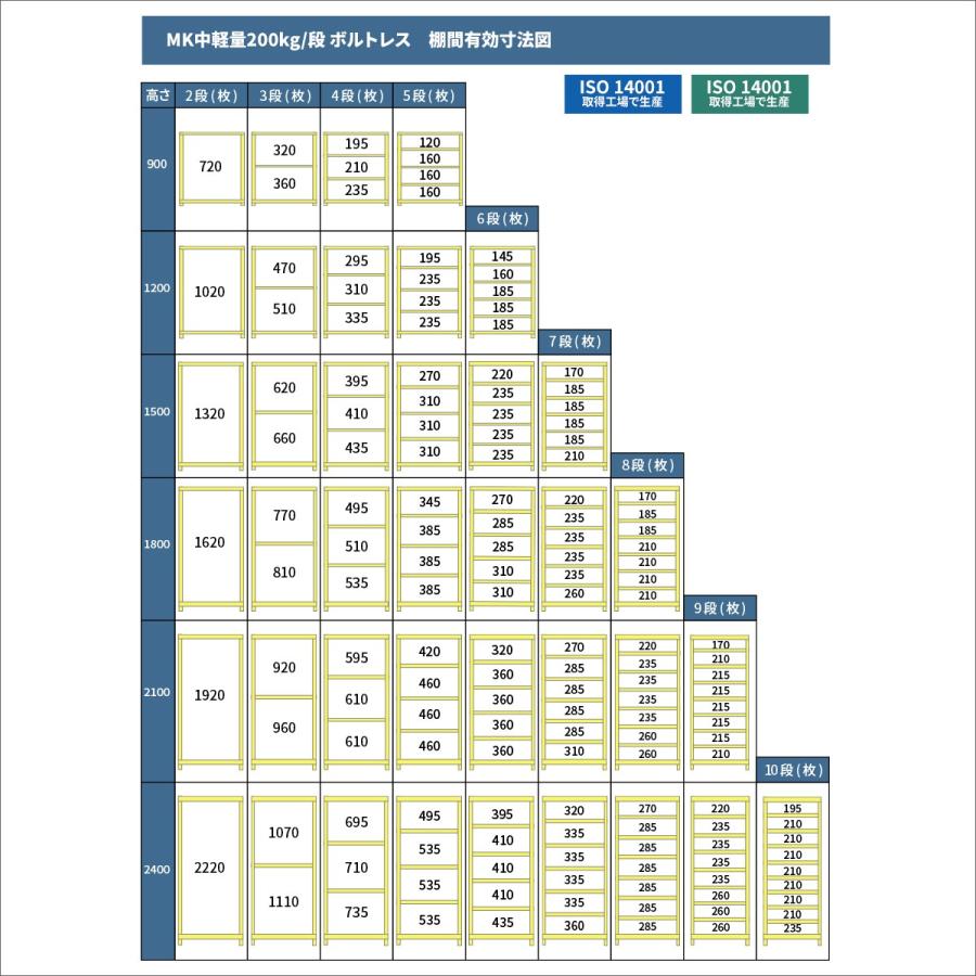 1段あたり200kgの耐荷重を備えた中軽量ラックは、倉庫や工場はもちろんオフィスでの物品収納から店舗での商品展示、個人宅のガレージや物置でも活用する万能ラックです!●個別仕様段数 :2段 (有効積載空間数:1)重量 :27kgサイズ:[表示寸法] 高さ1800×横幅1200×奥行300mm[実寸法] 高さ1805×横幅1240×奥行300mm[棚板寸法] 横幅1155×奥行285mm●シリーズ共通仕様シリーズ :MK 中軽量スチールラック組立方式 :ボルトレスタイプ(ボルト不使用)形式 :単体形式(支柱4本)耐荷重 :200kg/段全体耐荷重:800kg/台色(塗装):ライトアイボリー材質 :スチール製生産 :日本(国産)棚板取付穴間隔:25mmピッチ―――――――2段からお好みの段数で買える送料無料の国産業務用スチールラック・スチール棚!<使用例>・重量物の多い大型倉庫や工場などの物品棚・商業施設や店舗での商品の展示販売用陳列棚・店舗バックヤードでの保管棚・オフィスの書庫や整理棚・一般家庭のキッチンラックやテレビボード、本棚・ガレージでのタイヤや工具の保管棚・物置き内の収納棚"}