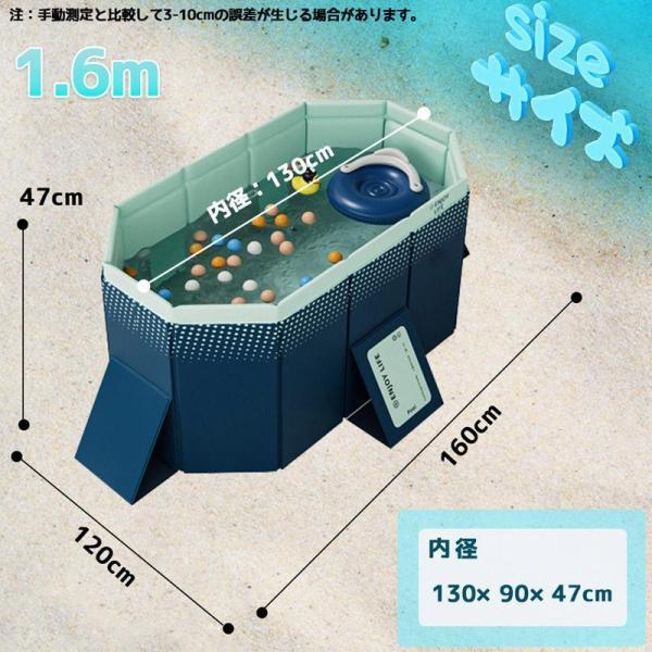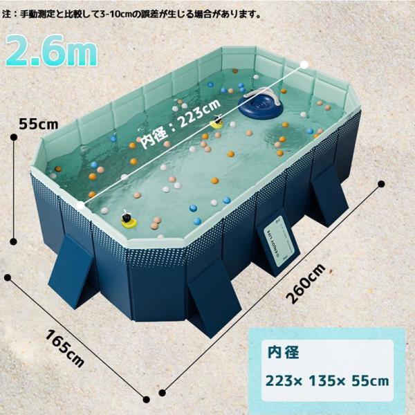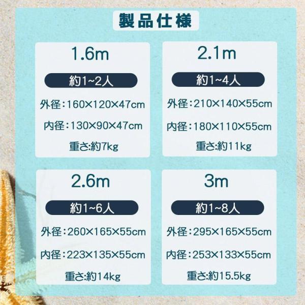 材質: PVCセット内容:プール本体*1【サイズ】1.6M:160×120×47cm 適用人数:1-2人1.8M:185×138×53cm 適用人数:1-3人2.1M:210×140×55cm 適用人数:1-4人2.6M:260×165×55cm 適用人数:1-6人3.0M:295×165×55cm 適用人数:1-8人商品詳細【使いやすさが魅力のプール】:折りたたみプール、組み立て不要、めんどな空気入れする必要がなく、穴が開いて萎んでしまう心配もございません!わざわざ高価な電動エアーポンプを購入する必要もない!屋外でも室内でも使える、暑い季節に大活躍!普段使わないときは、折りたたんでコンパクトに収納!【滑り止め、ペットと子供に安全】: 折りたたみ式プールは、内壁と底の両方に厚い滑り止め素材を備えており、水を楽しんでいるときに滑りや落下を防ぎます。 子供用プールの側面では、子供やペットが簡単に飛び越えて水遊びを安全に行うことができます。【広範な用途】:屋外プール、バスタブ、おもちゃの箱、1台3役で1年中使える!お子様の水遊び、大きな物を