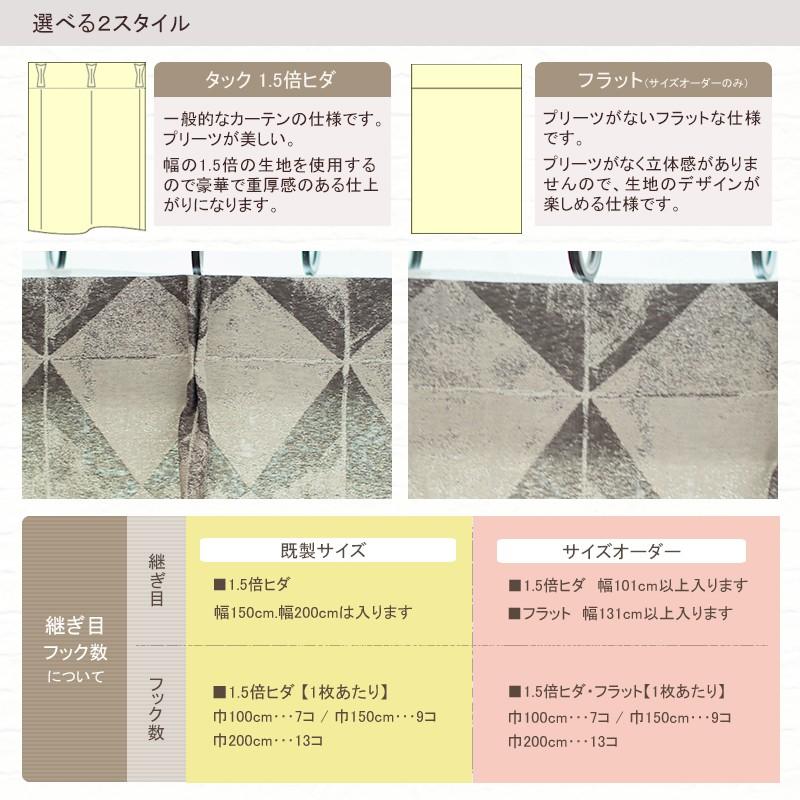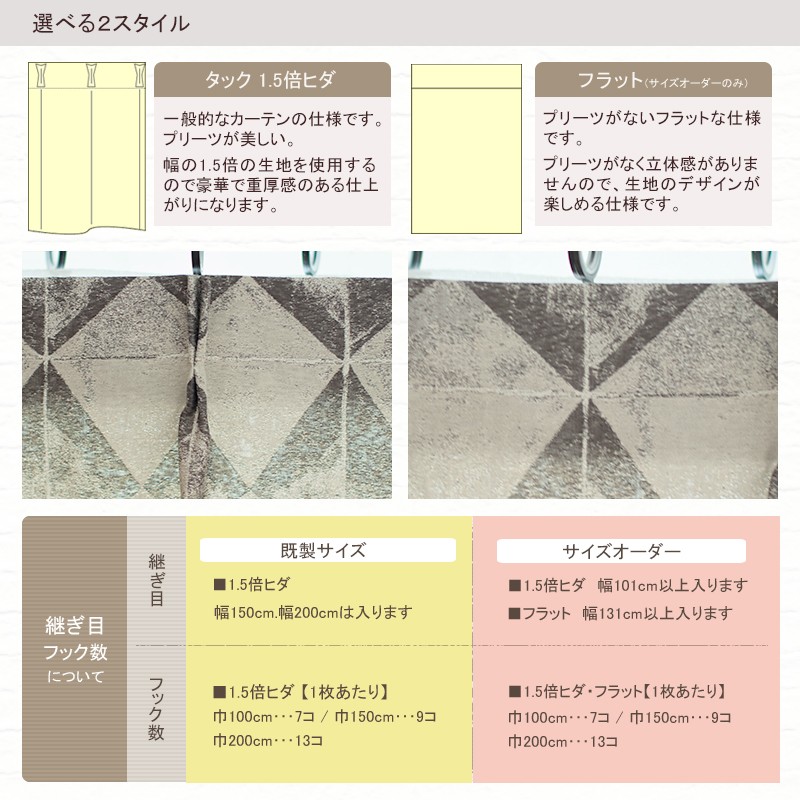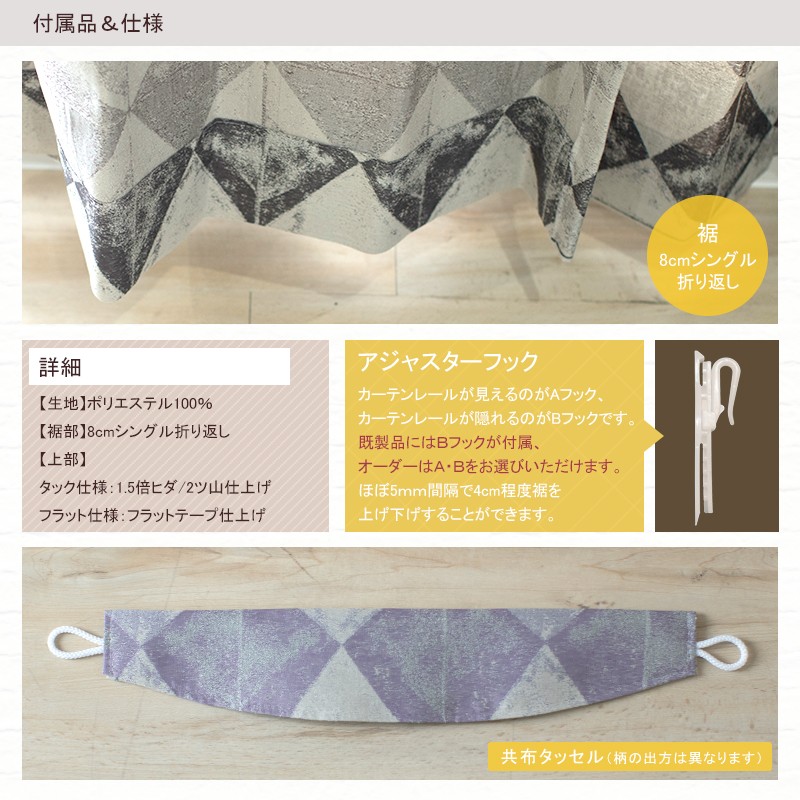 シックなカラーリングの北欧モダンカーテンです。■材質ポリエステル100%■機能ウォッシャブル(手洗い)形態安定加工:なし■付属品既製:アジャスターフック(Bタイプ)サイズオーダー:アジャスターフック(A B選択)共布タッセル■フックの数★既製サイズ【1枚あたり】└1.5倍ヒダ:巾100cm・・・7コ / 巾150cm・・・9コ / 巾200cm・・・13コ★サイズオーダー【1枚あたり】└巾〜102cm・・・7コ / 巾〜153cm・・・9コ / 巾〜200cm・・・13コ■継ぎ目★タックカーテン:101cm★フラットカーテン:131cm ■ご注意・オーダー商品のためご注文確定後の返品・交換はできませんので予め、確認の上ご購入ください。・ご注文後の変更・交換・キャンセルはお受けすることができません。また、出荷完了後の変更については、交換対応となり、料金が必要となりますので、事前にご確認をいただいた上でのご注文をお願いいたします。 デザインカーテン オーダーカーテン ダマスク 光沢 高級感 輸入カーテン インポートカーテン リビング キッチン 寝室